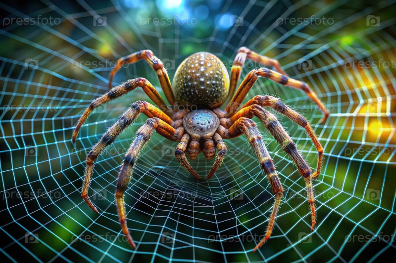 Трехмерный паук в сети, освещенной мягким солнечным светом в лесу
