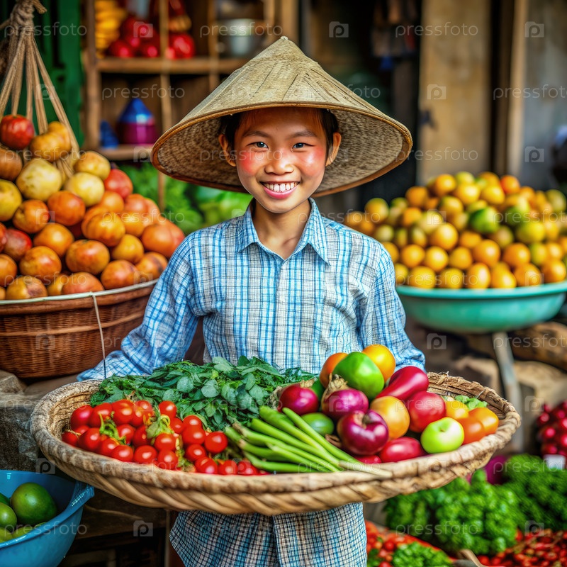 Молодой азиатский продавец улыбается, держа в руках корзины с свежими фруктами и овощами на местном рынке