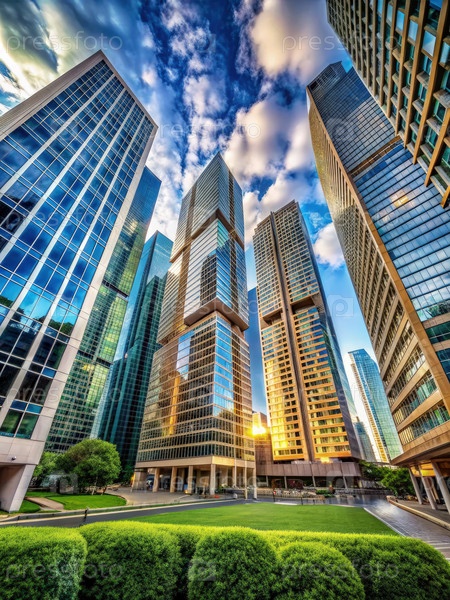Современный городской пейзаж со стеклянными небоскребами под ярким небом на закате