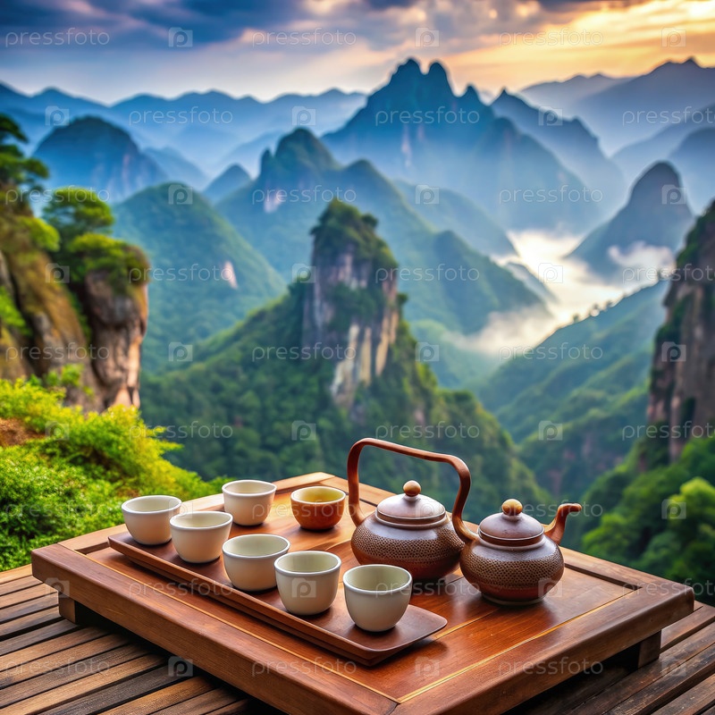 Наслаждайтесь традиционным китайским чаем среди захватывающих горных пейзажей Китая на закате, демонстрируя богатую культуру и потрясающие ландшафты