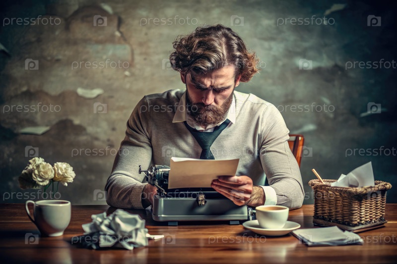 Сосредоточенный писатель печатает на старинной пишущей машине с кофе и записями поблизости