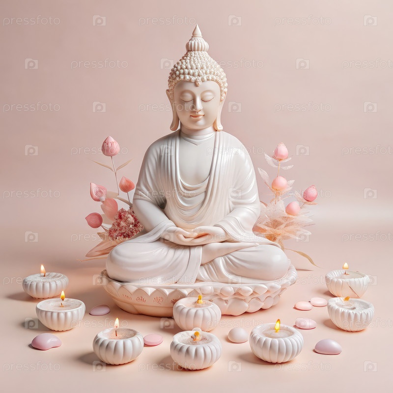 Спокойная статуя Будды грациозно сидит среди плавающих свечей и нежных цветов, создавая спокойную атмосферу, идеально подходящую для медитации и размышлений