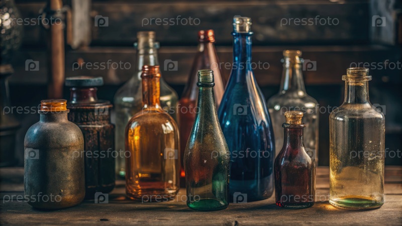 Коллекция красочных винтажных бутылок, расположенных на деревянном столе в очаровательной, слабо освещенной обстановке с различными формами и размерами