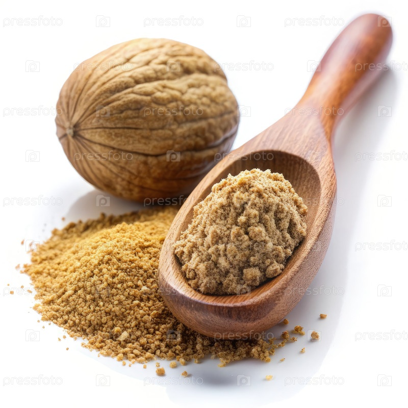 Целый и измельченный мускатный орех в деревянной ложке на белом фоне