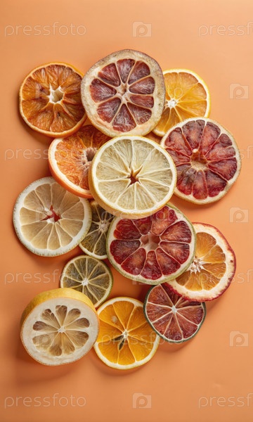 Цветные кусочки сухофруктов расположены на оранжевом фоне