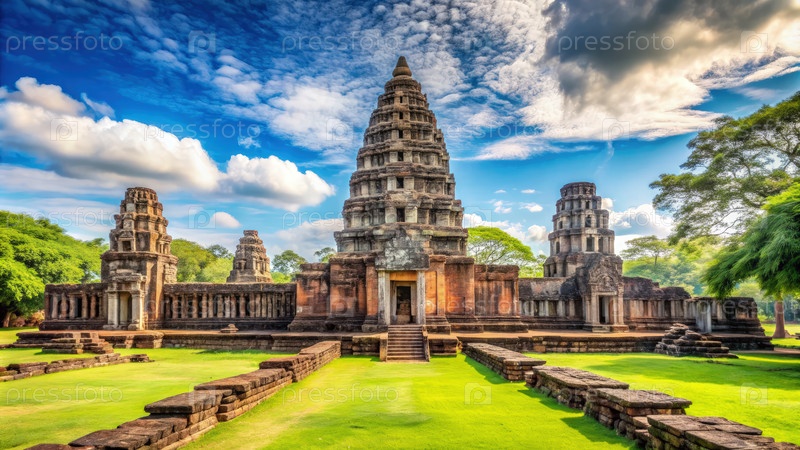 Руины древнего города Фимай демонстрируют сложную кхмерскую архитектуру под ярким небом