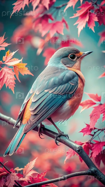 Птица сидела на ветке среди ярких осенних листьев в безмятежном пейзаже