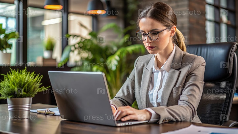 Деловая женщина анализирует данные на ноутбуке в современной офисной среде