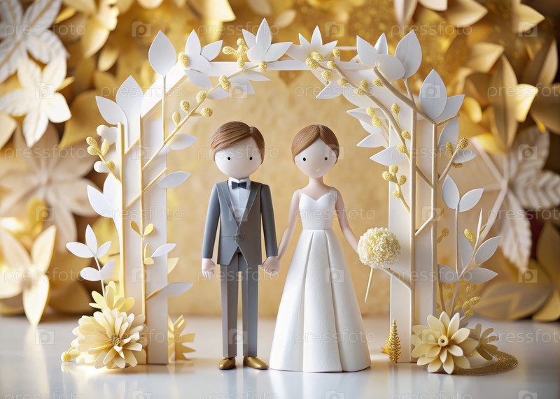 Минималистская бумажная свадьба пары под цветочной аркой в мягких оттенках