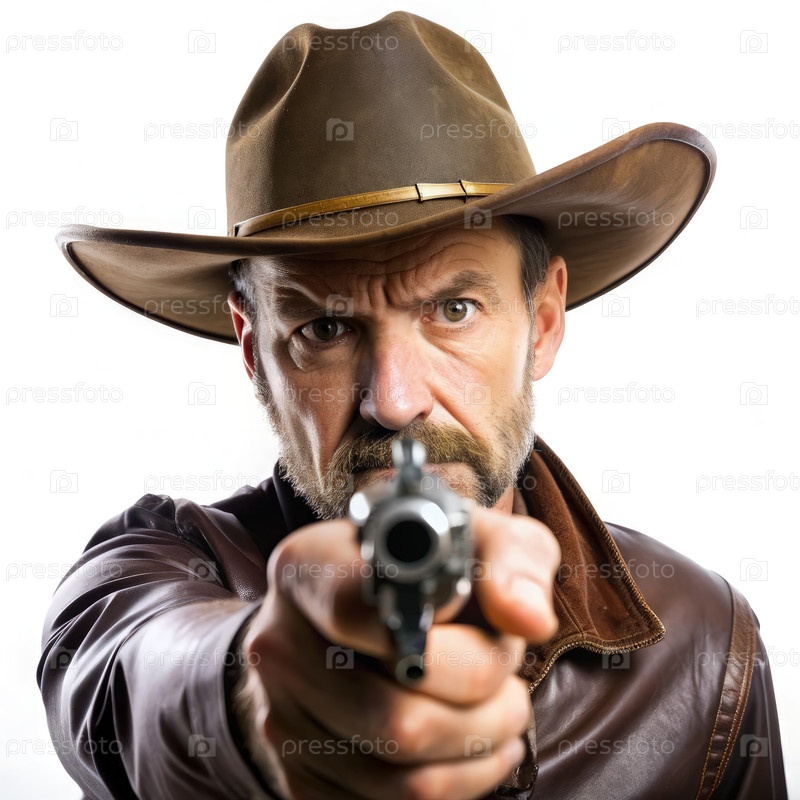 Ковбойский шериф, нацеленный пистолетом в напряженное противостояние в западной обстановке поздним днем