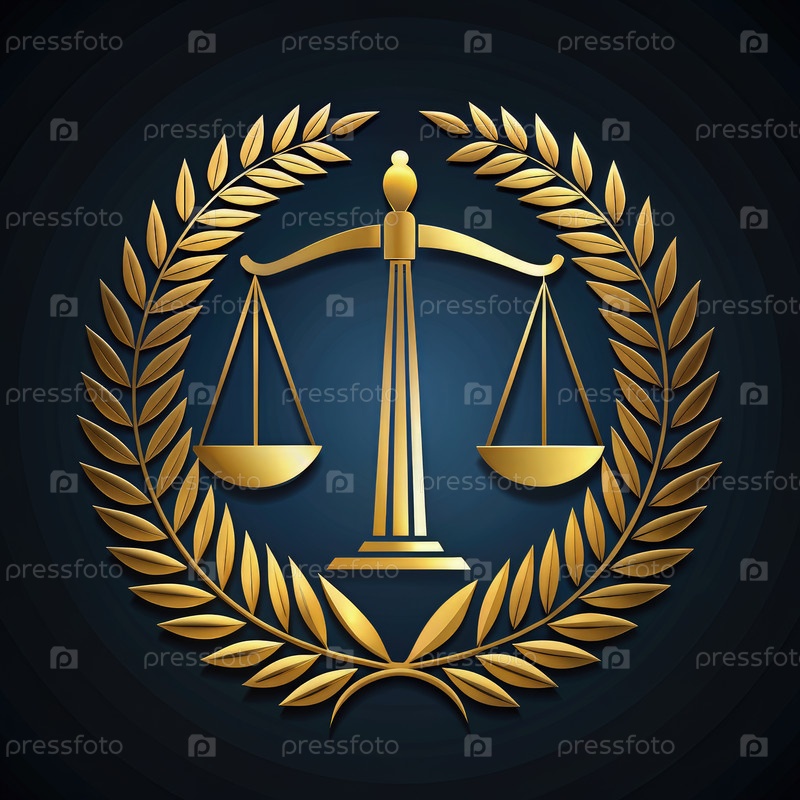 Золотые чешуи правосудия, окруженные лавровым венком на темном фоне, символизируют закон и справедливость в профессиональной среде