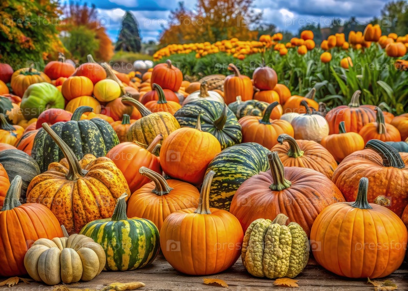 Вибрирующее поле тыквы, наполненное разнообразными тыквами и тыквами в солнечный осенний день в красочной среде сбора урожая