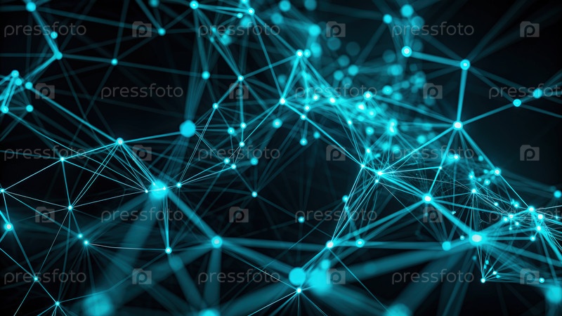 Абстрактная визуализация сети с светящимися синими узлами и соединениями на темном фоне