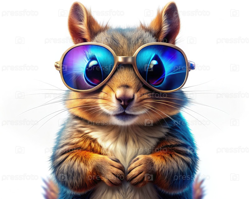 Крутая белка в стильных солнцезащитных очках, уверенно позирующая на чистом белом фоне, захватывая сущность игривого обаяния и личности