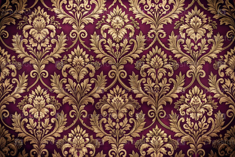 Элегантный образ винтажного дамаска в богатых тонах бургундского и золотого цветов