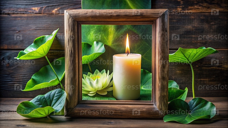 Свеча, обрамленная листьями лотоса на деревянной поверхности