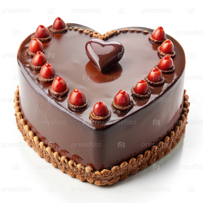 Вкусный шоколадный торт в форме сердца с элегантными декорациями и богатой глазурью, идеально подходит для романтических праздников или специальных случаев
