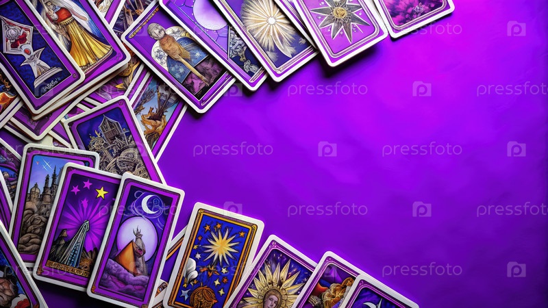 Рассеянные карты Таро на фиолетовом фоне в минималистической композиции