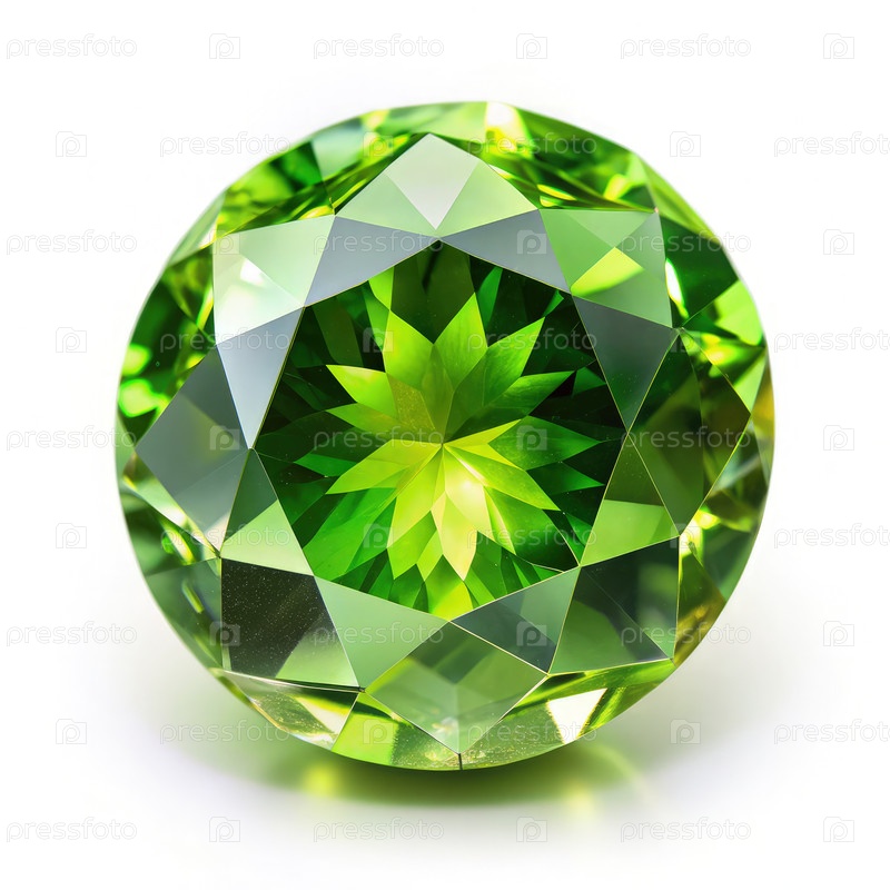 Потрясающий жемчуг перидота с яркими зелеными оттенками, изолированным на чистом белом фоне, демонстрируя свои сложные аспекты и красоту