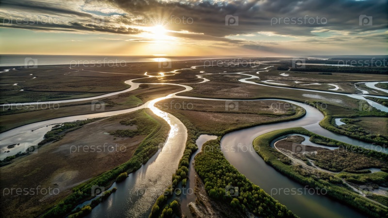 Вид с воздуха извилистой дельты реки на закате, демонстрирующий пышные водно-болотные угодья в ярком пейзаже