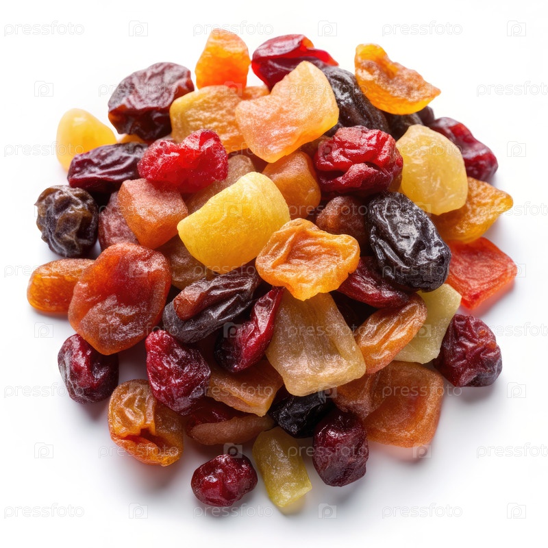 Красочный ассортимент привлекательных кусков сухофруктов на чистом белом фоне