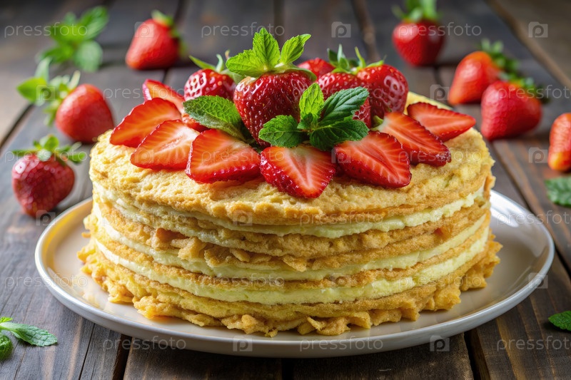 Вкусный торт Наполеона с свежими клубниками на деревянном столе