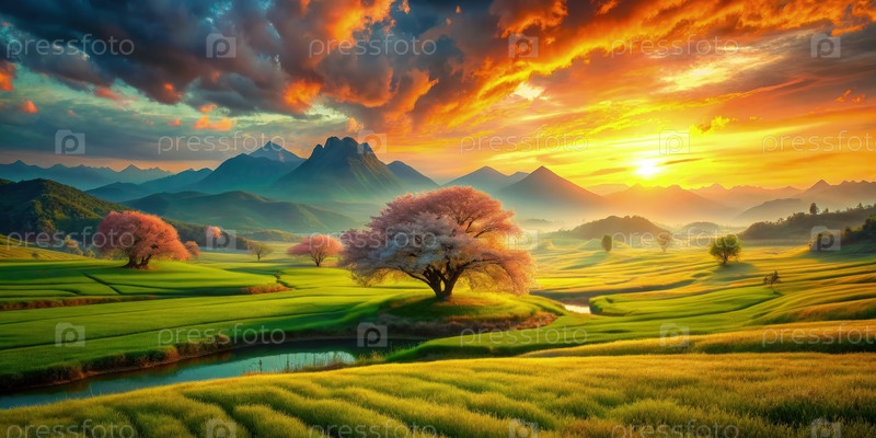 Завораживающий закат солнца над пышными зелеными долинами с цветущими вишневыми деревьями в живописном ландшафте