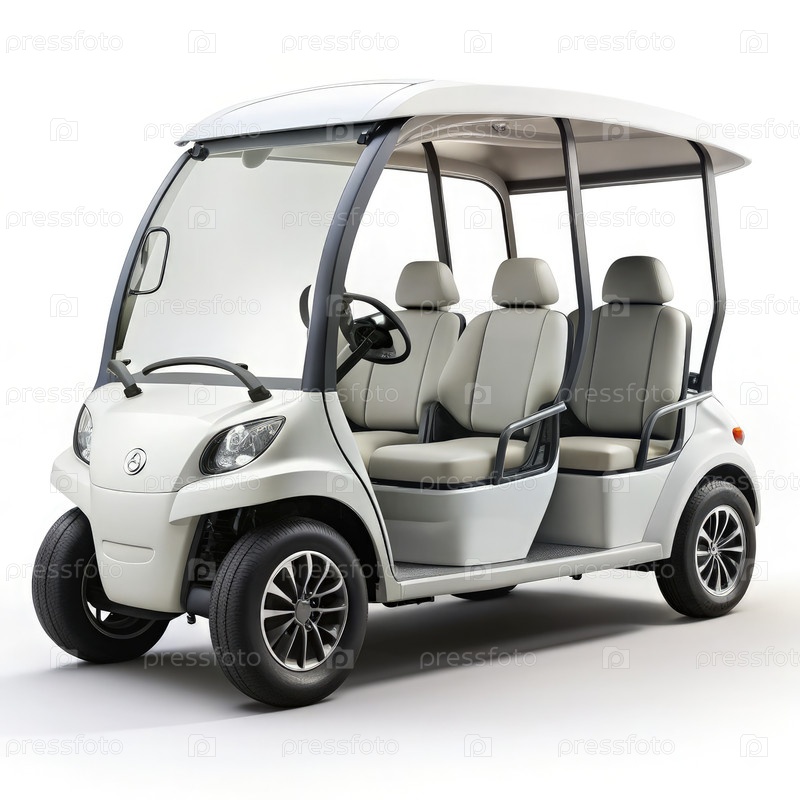 Электрический четырехместный курортный автомобиль, припаркованный на белом фоне для демонстрации