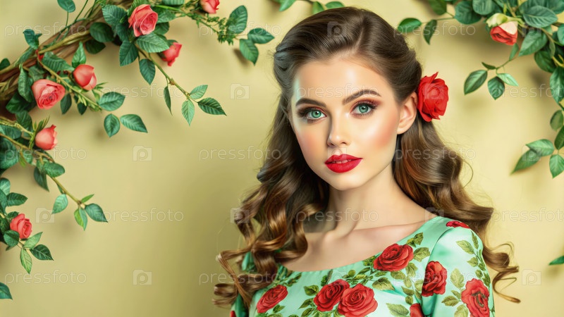 Красивая молодая леди в ярко-красном розовом платье грациозно позирует на фоне, украшенном пышными зелеными листьями и нежными розами