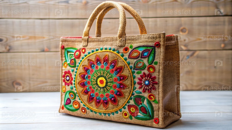 Красочный ручной вышитый пакет из джута, отображаемый на деревянном фоне