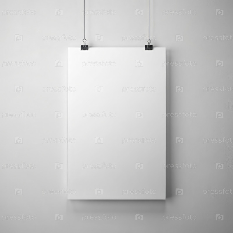 Пустой плакат на белой стене, подвешенный клинками в минималистическом пространстве