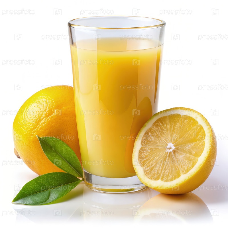 Освежающий стакан апельсинового сока с лимонным кусочком на ярком фоне