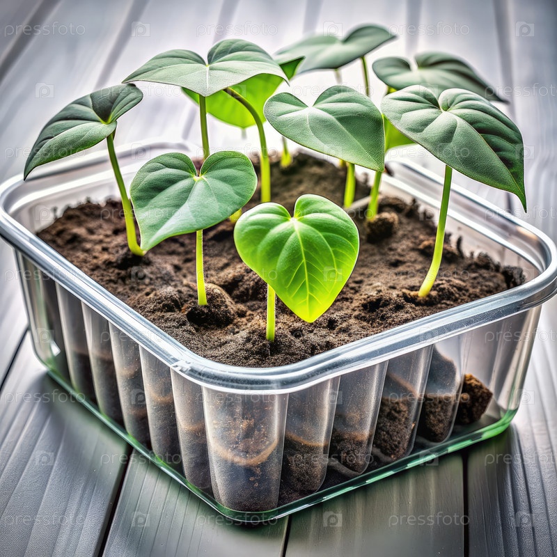 Выращивание саженцев пауловнины в прозрачном контейнере с почвой на поверхности