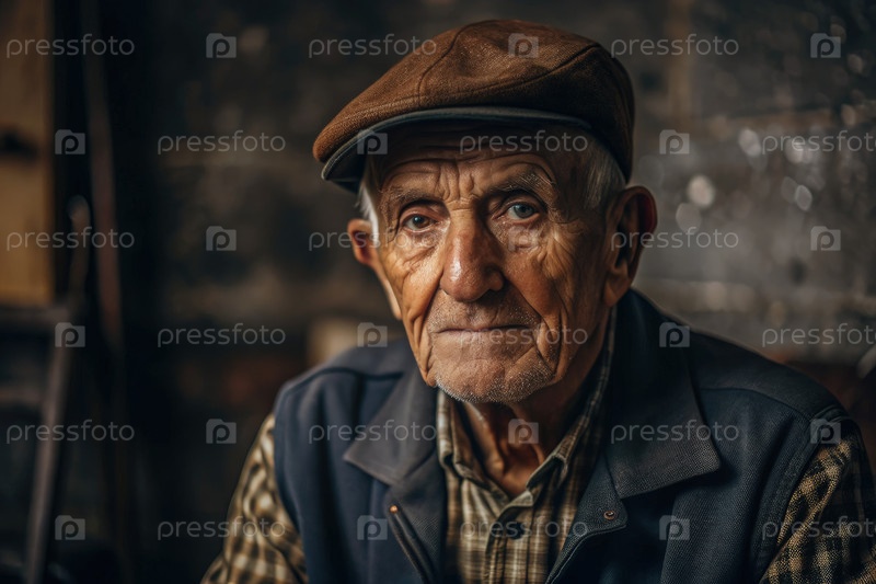 Старый мужчина, одетый в шляпу, задумчиво позирует в деревенской мастерской днем