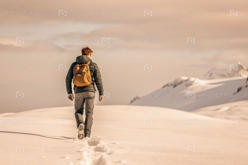 Человек, путешествующий по заснеженным горам зимой