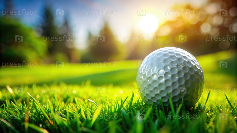 Близкий взгляд на один мяч для гольфа, отдыхающий на пышной зеленой траве, освещенный мягким солнечным светом во время спокойного дня на поле
