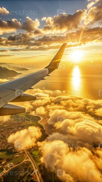 Вид с воздуха потрясающего захода солнца над океаном с яркими облаками и золотыми лучами из крыла самолета во время сумерек