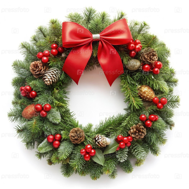 Красиво украшенный рождественский венок с яркой красной лентой, сосны и праздничные орнаменты, идеально подходят для праздничных декораций