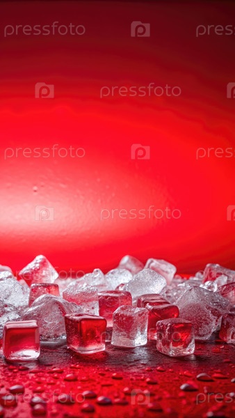 Ледяные кубики разбросаны на красном фоне с отражающимися капельками воды в вечернем свете