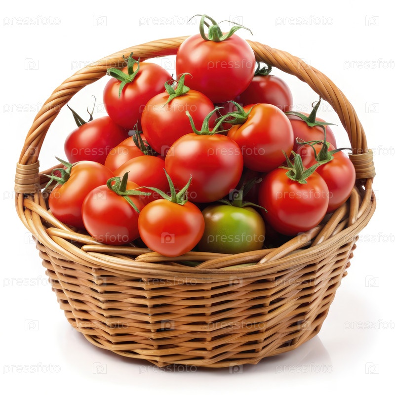 Рустичная корзина, переполненная спелыми красными помидорами, демонстрирует свежие продукты на простом белом фоне, подчеркивая сельскохозяйственное изобилие и сезонный урожай