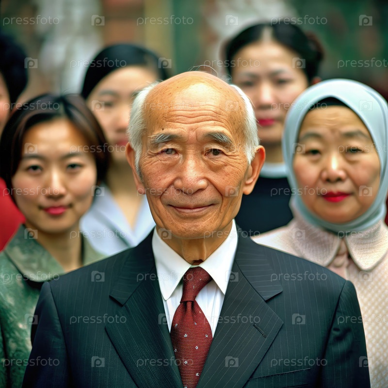 Пожилой китайский мужчина с белыми волосами гордо стоит среди молодых женщин в традиционной одежде