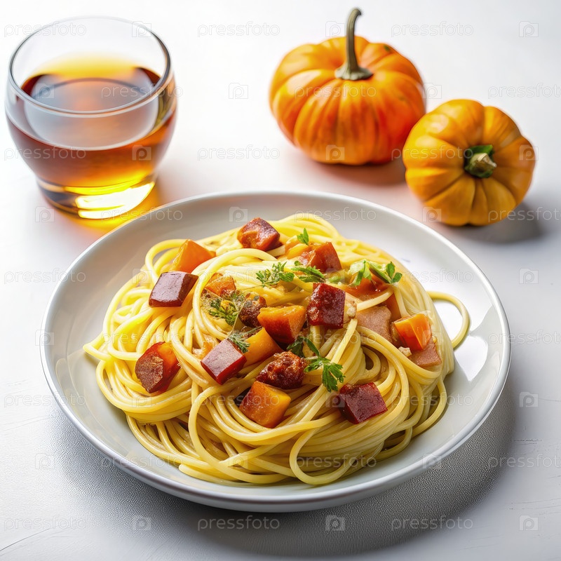 Спагетти с тыквенным ликером и беконом, украшенными травами на столе