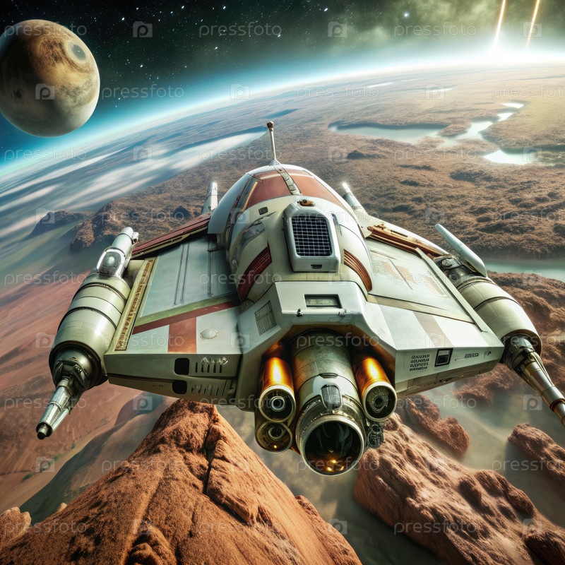 Дизайн космического корабля, вдохновленный научно-фантастической вселенной, летит над скалистым планетарным ландшафтом