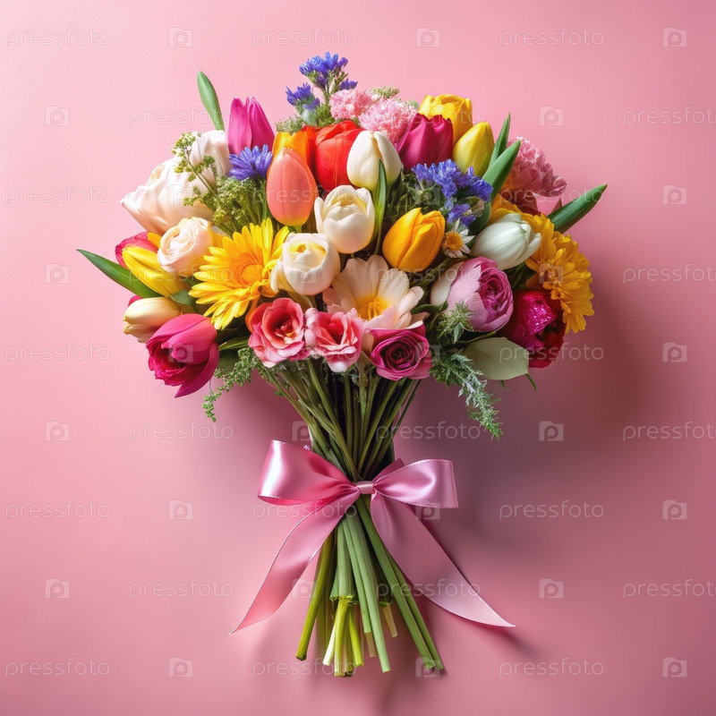 Вибрирующий творческий букет свежих цветов на мягком розовом фоне