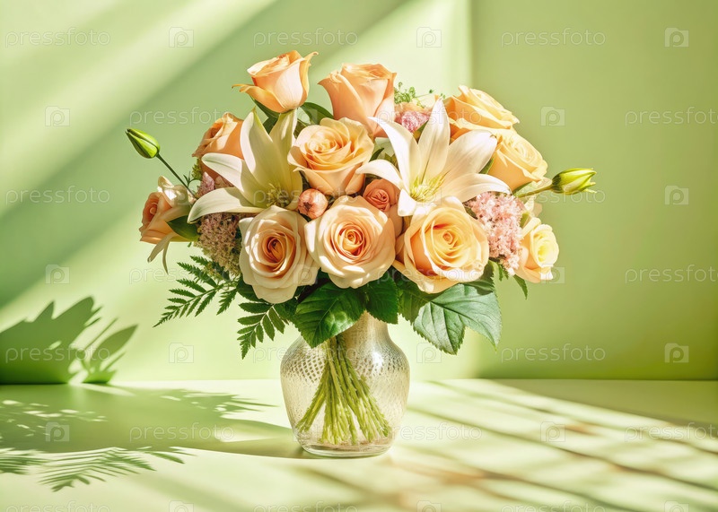 Яркий букет с розами и лилиями в прозрачной вазе на мягком зеленом фоне, захватывающий спокойный и красочный момент весны