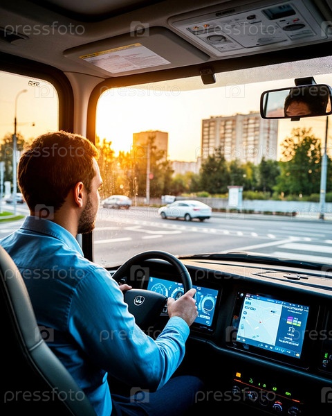 Водитель автобуса в современном салоне электробуса