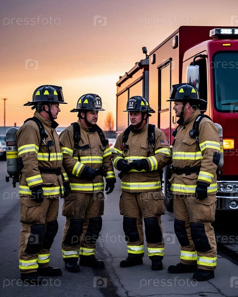 Пожарные в защитной форме рядом с красным пожарным автомобилем на закате