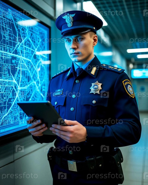 Полицейский в форме с планшетом на фоне цифровой карты