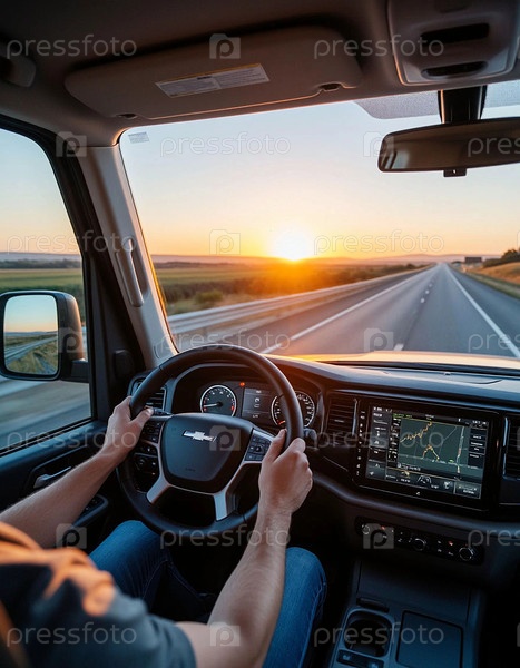 Водитель-дальнобойщик в кабине современного грузовика на трассе в лучах заката