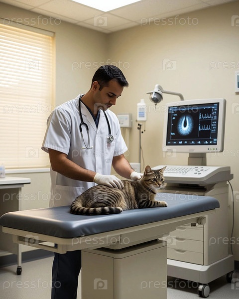 Ветеринар осматривает домашнюю кошку в современной ветеринарной клинике